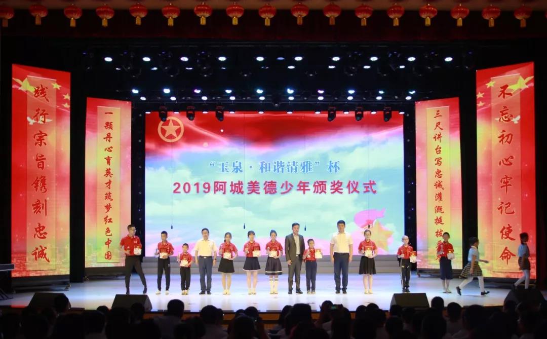 此次“2019阿城區(qū)美德少年”評選頒獎大會由玉泉·和諧清雅聯(lián)手阿城區(qū)委宣傳部、區(qū)文明辦、區(qū)教育局共同舉辦。這也是玉泉酒業(yè)連續(xù)第四年支持家鄉(xiāng)教育事業(yè)的發(fā)展,本次經(jīng)過學校推薦、網(wǎng)絡投票和評審公示,10名同學獲得了阿城區(qū)“美德少年”榮譽稱號。阿城區(qū)委常委、副區(qū)長李曉峰,玉泉酒業(yè)董事長楊立友等相關領導及各中小學校長、教師、學生和學生家長代表均參加了此次阿城區(qū)美德少年頒獎典禮。